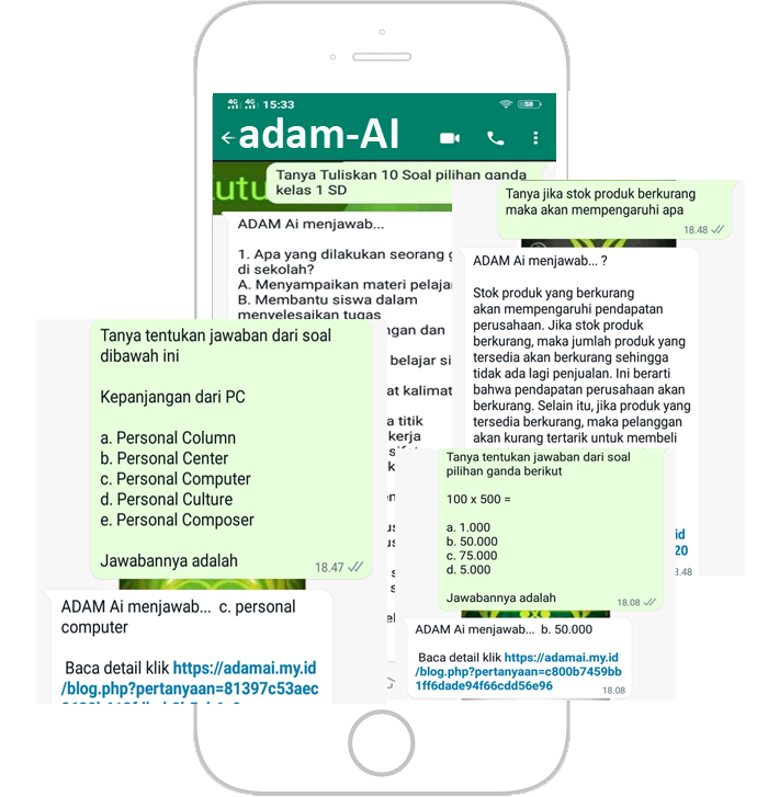 adam AI adalah layanan mesin elearning berbasis teknologi OpenAI yang memungkinkan anda mendapatkan informasi apa saja dan cepat via whatsapp. Keakuratan informasi tergantung pertanyaan yang anda kirimkan.